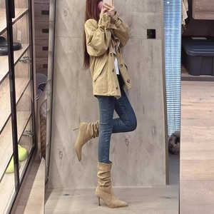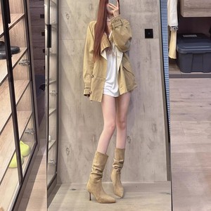 美拉德靴子女细高跟2025新款卡其色尖头褶皱显瘦中筒堆堆靴