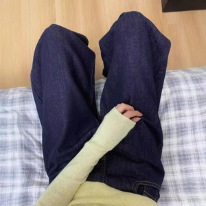 【韩牛】美式复古牛仔裤秋冬新款深蓝色阔腿高腰宽松拖地垂感长裤
