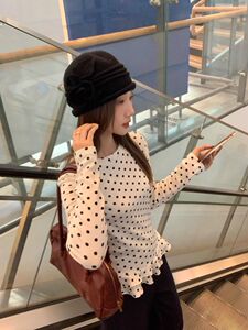 原版面料 甜美风白色波点长袖T恤女春季荷叶边打底衫显瘦内搭上衣