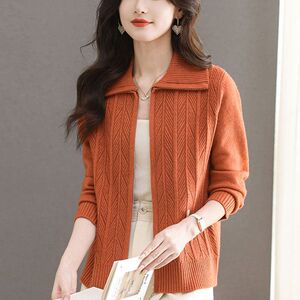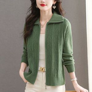 鸿2079新款针织羊毛衫翻领外套宽松开衫毛衣春秋拉链上衣洋气外套