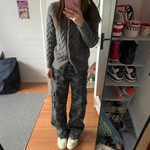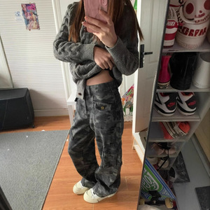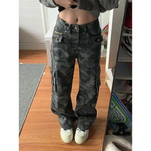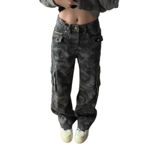【韩牛】辣妹高街高腰宽松超显瘦拖地迷彩设计感口袋工装牛仔裤女