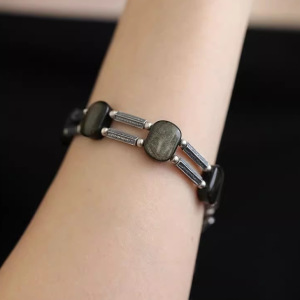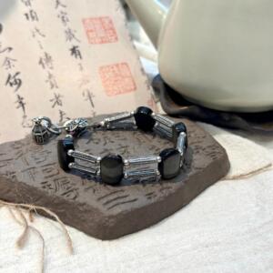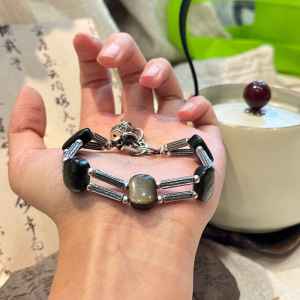 S925银五条经文管六字真言尾吊莲花扣旦形金曜石手链