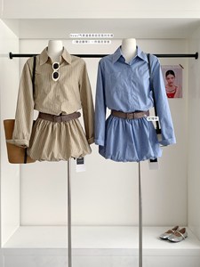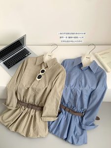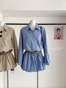 实拍2025韩版新款显瘦气质百搭通勤高腰花苞条纹衬衫裙女
