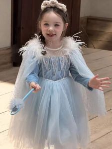 2025女童爱莎艾莎冰雪儿童公主裙纱裙小女孩生日礼服裙长袖羽毛款