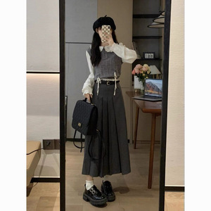 套装女秋季新款学院风毛衣衬衫假两件针织上衣复古气质灰色半身裙