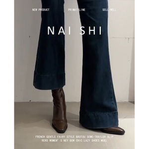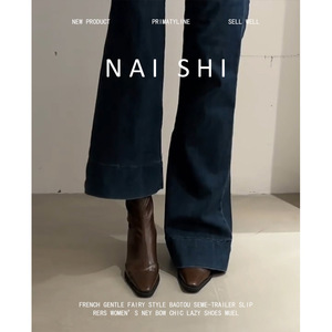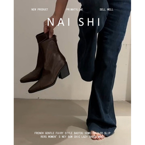 羊皮版!复古气质尖头粗跟短靴女后拉链高跟切尔西靴显瘦真皮裸靴