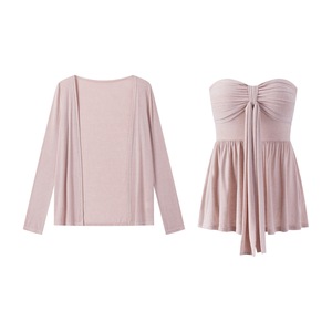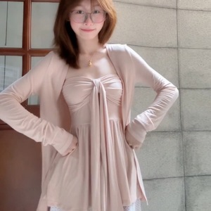 慵懒宽松粉色长袖防晒开衫女夏季套装纯欲飘带抹胸背心上衣两件套