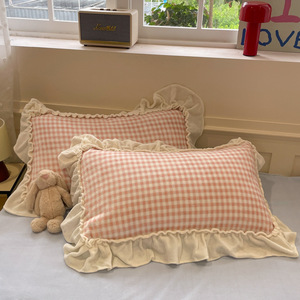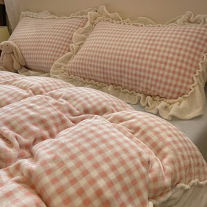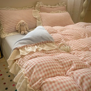 ins粉格子加厚牛奶绒四件套 法式公主风双面珊瑚绒床单被套三件套