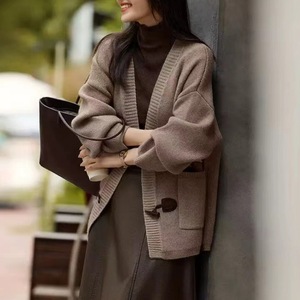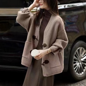 秋冬新款时尚宽松慵懒风针织开衫女韩系牛角扣复古纯色V领毛衣外