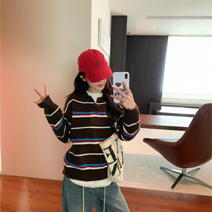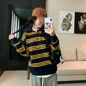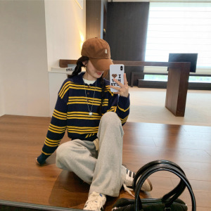 实拍 2025秋季复古经典翻领条纹套头针织衫女宽松百搭减龄毛衣女