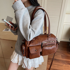 跨境复古休闲大容量托特包包女2025夏季高级感多口袋单肩斜挎包潮
