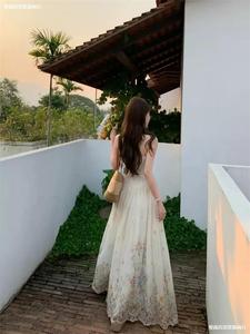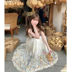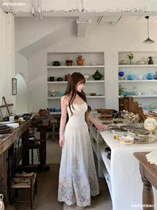 法式小香风白色碎花抹胸吊带连衣裙女款小个子收腰无袖长裙子
