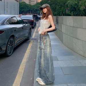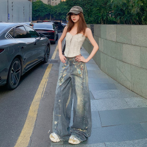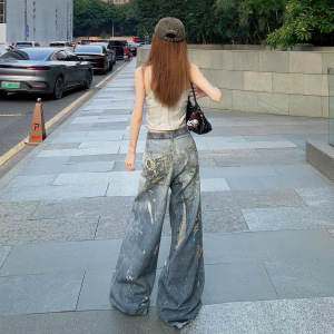 【今茵】新品潮牌美式复古印花涂鸦链条脏染设计感阔腿牛仔裤男女