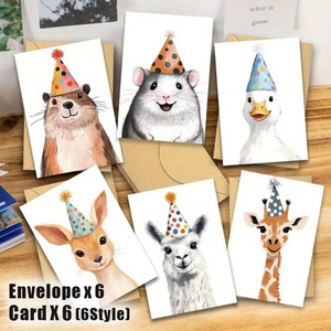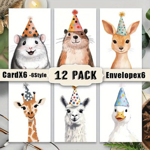 亚马逊跨境热卖派对用品趣味生日贺卡套装含信封戴派对帽卡通动物