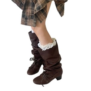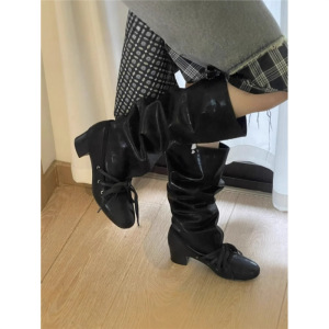 高颜值复古圆头绑带褶皱堆堆靴女粗跟高筒靴2025秋新款西部牛仔靴