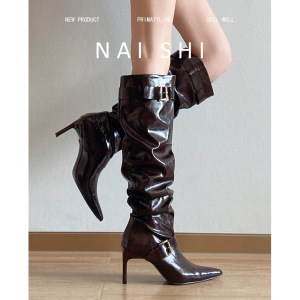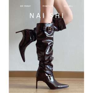 羊皮版!复古褶皱堆堆高跟靴女皮带扣尖头不过膝长靴细跟高筒靴