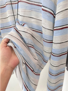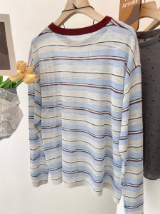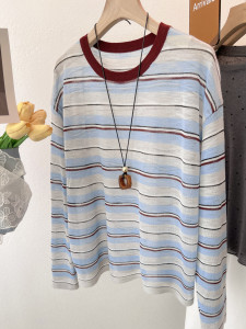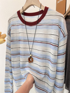 韩系小众设计感撞色条纹冰丝针织长袖罩衫女夏季薄款防晒外搭上衣