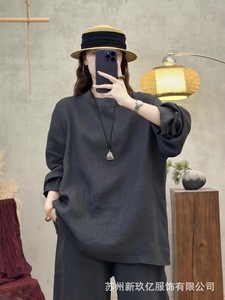 2025秋季新款亚麻T恤衫女文艺时尚圆领纯色简约宽松大版长袖上衣