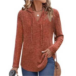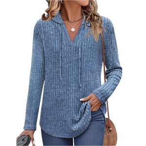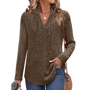 2025亚马逊秋冬新款纯色大码女装上衣V领连帽长袖坑条磨毛T恤宽松
