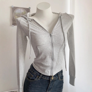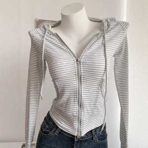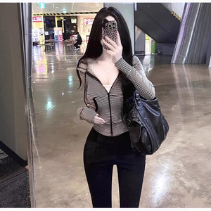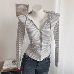 新款~韩版显身材小外套上衣女短款休闲纯欲条纹连帽开衫上衣