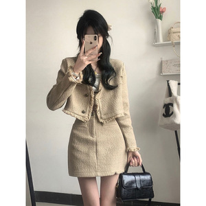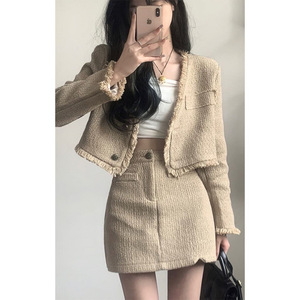 【两件套装】小香风辣妹设计感流苏V领短款外套女+高腰显瘦半身裙