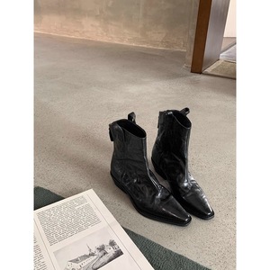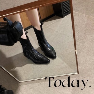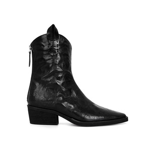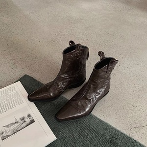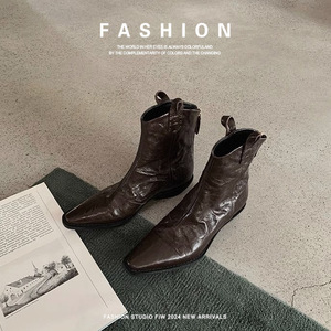头层牛皮葡萄妈显瘦车缝线粗跟鞋真皮同款西部短靴尖头时髦褶皱