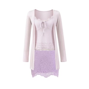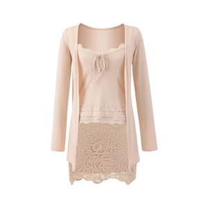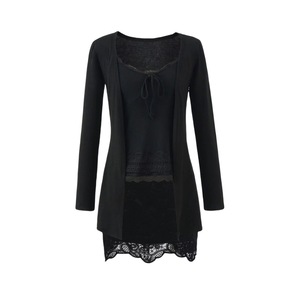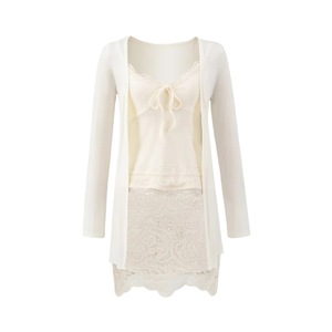 宽松外搭长袖无扣开衫外套V领蕾丝拼接修身吊带背心包臀短裙套装