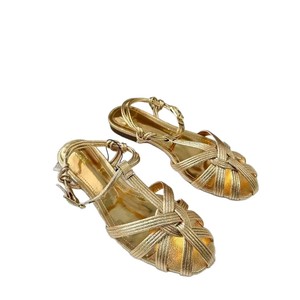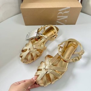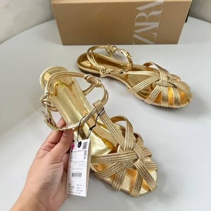 ZA2025夏季金色后绑带小众月光法式包头手工编织罗马软皮凉鞋女