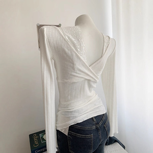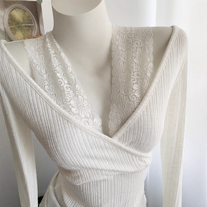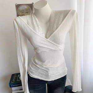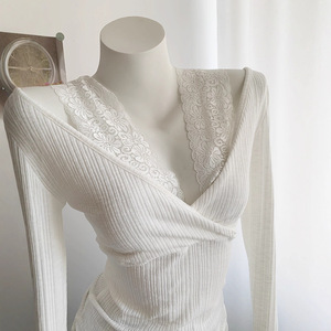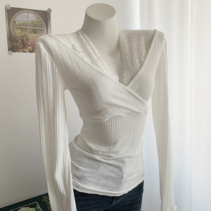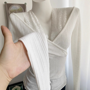 人气新品~蕾丝拼接假两件V领长袖恤上衣女别致漂亮甜辣洋气打底衫