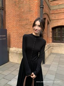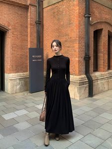 显瘦黑色长袖针织连衣裙女春秋韩系收腰修身气质打底裙长裙子