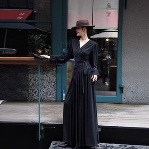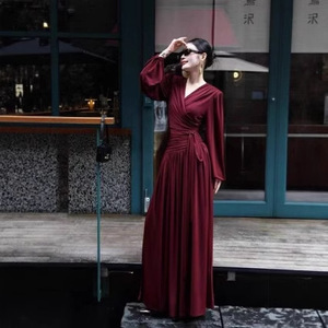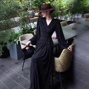 新款气质女装 高档V领早秋气质收腰连衣裙 时尚女装长裙