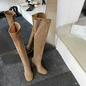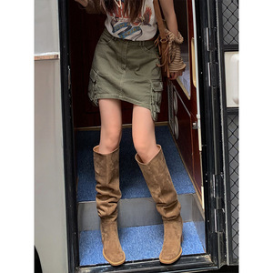 韩国欧尼~复古粗跟堆堆靴高筒靴褶皱宽大西部牛仔靴长靴