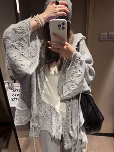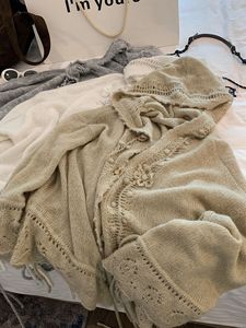 重工韩系慵懒松弛感钩花针织连帽大开衫女薄款羊毛针织衫毛衣