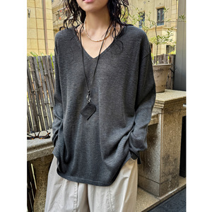 早秋新款韩版简约休闲风V领廓形针织衫轻盈透气显瘦上衣女