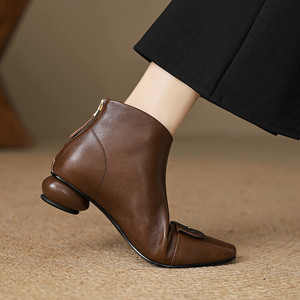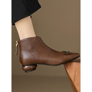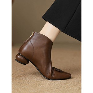 洋气小短靴女靴春秋单靴圆头中跟粗跟后拉链棕色气质冬加绒