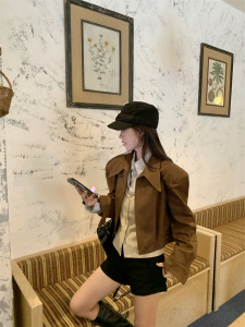 美拉德穿搭咖色翻领外套女早秋新款小个子短款高级感气质夹克