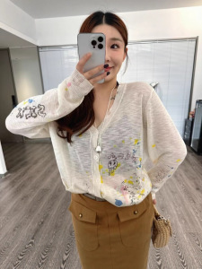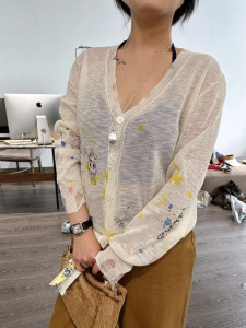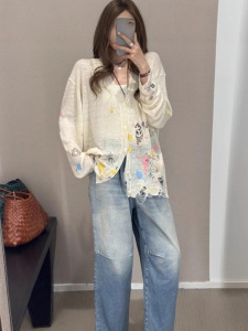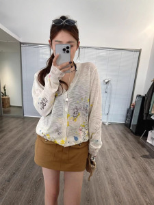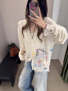 白鹿同款25早秋新款彩绘涂鸦毛边磨烂口袋V领羊毛针织开衫外套女