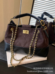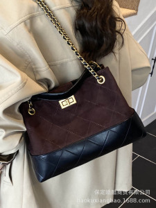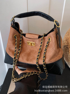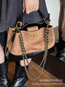 复古质感撞色麂皮绒水桶包女2025新款腋下包百搭水桶包单肩手提包