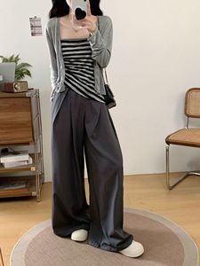 新款大码女装早秋防晒开衫上衣+条纹背心+阔腿裤三件套