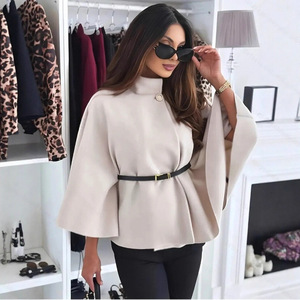 跨境亚马逊欧美女装冬季时尚气质优雅风纯色收腰绑带毛呢斗篷外套