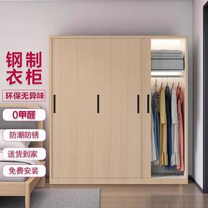 钢制木纹衣柜带锁家用卧室推拉门大容量收纳衣柜阳台儿童储物柜子