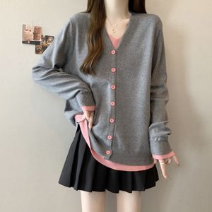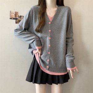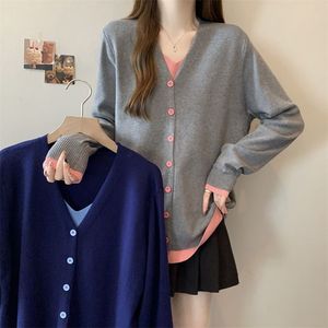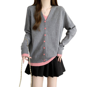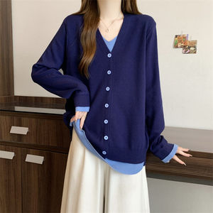 大码秋冬V领长袖毛衣打底衫胖mm宽松显瘦假两件针织上衣灰色蓝色