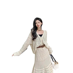 法式慵懒风镂空针织开衫名媛女春秋季高腰毛衣裙时尚两件套装
