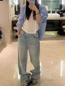 SUNONEOE 美式复古浅蓝色牛仔裤女夏秋新款做旧宽松直筒休闲裤子