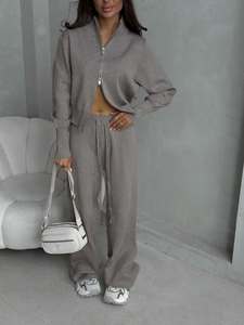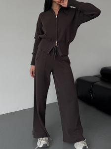 欧美秋冬季高级风纯色时尚休闲双拉链长袖开衫直筒软糯长裤两件套