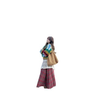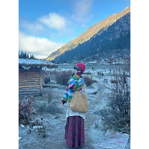 彩虹条纹毛衣+红色格子裙