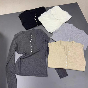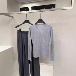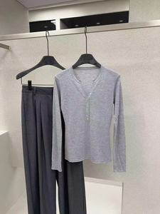 韩系纯欲辣妹正肩长袖v领t恤女秋季修身内搭打底显瘦百搭短款上衣