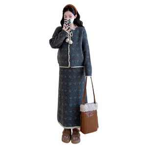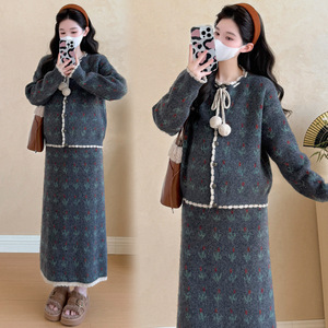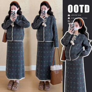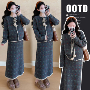 孕妇秋季新款系带针织毛衣开衫上衣+潮妈花边半身裙甜美显瘦套装
