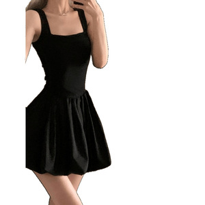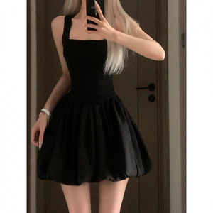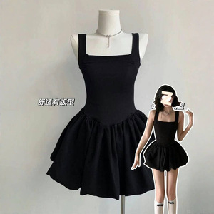 御姐风黑色吊带花苞裙连衣裙女夏收腰芭蕾风a字短裙子掐腰蓬蓬裙