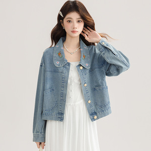 甜美小花刺绣娃娃领牛仔短外套女长袖2025春秋季韩版百搭休闲夹克